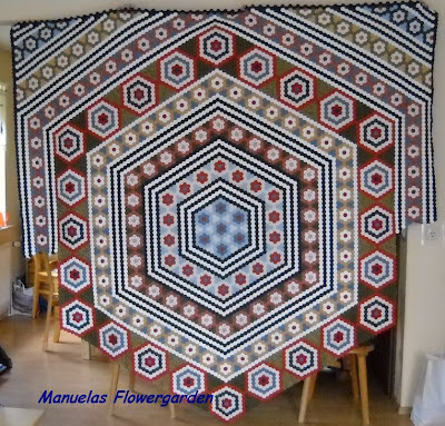 genau heute vor einem Jahr habe ich meinen ersten Post von meinem großen Hexagon Projekt: Memory Quilt to Prudence Jeffrey geschrieben. Damals hatte ich gerade mein Mittelteil fertiggenäht und das sah so aus: